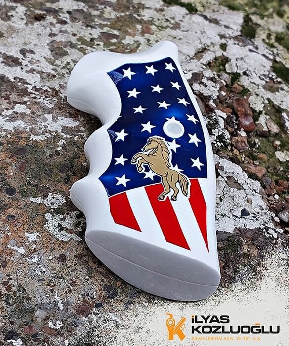 Colt Python Sarı Pirinç At Logolu Mineli ABD Bayrağı Tasarımlı Beyaz Pleksi Kabze